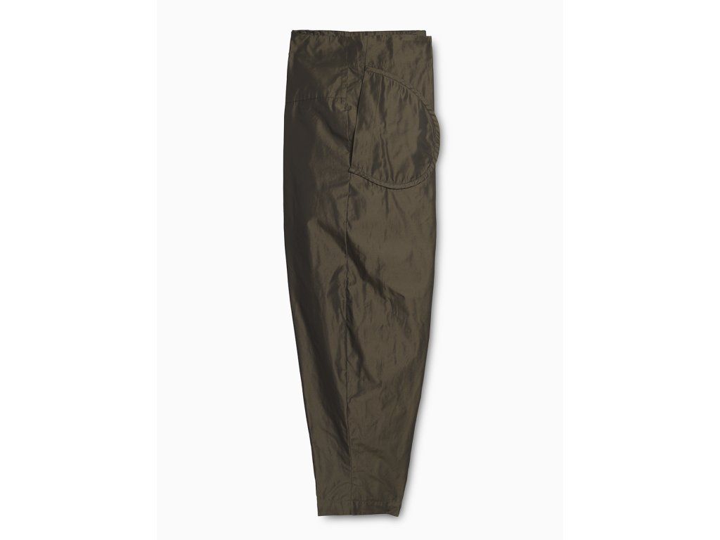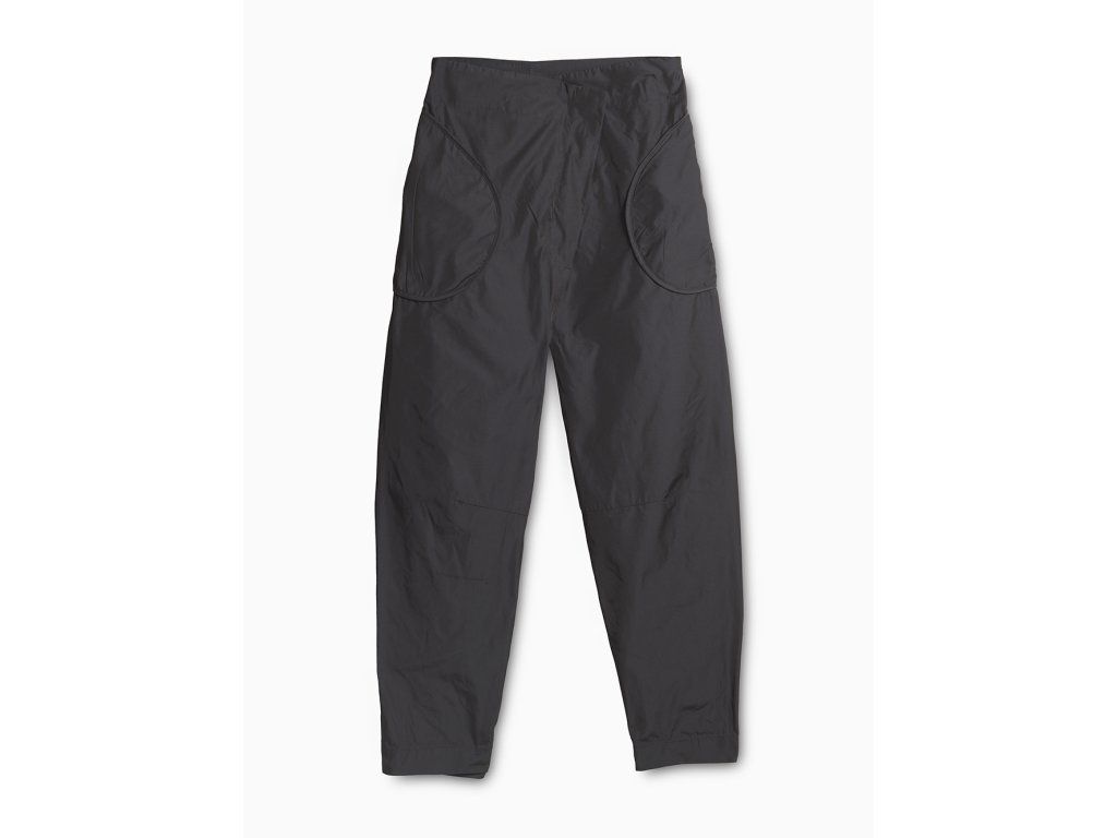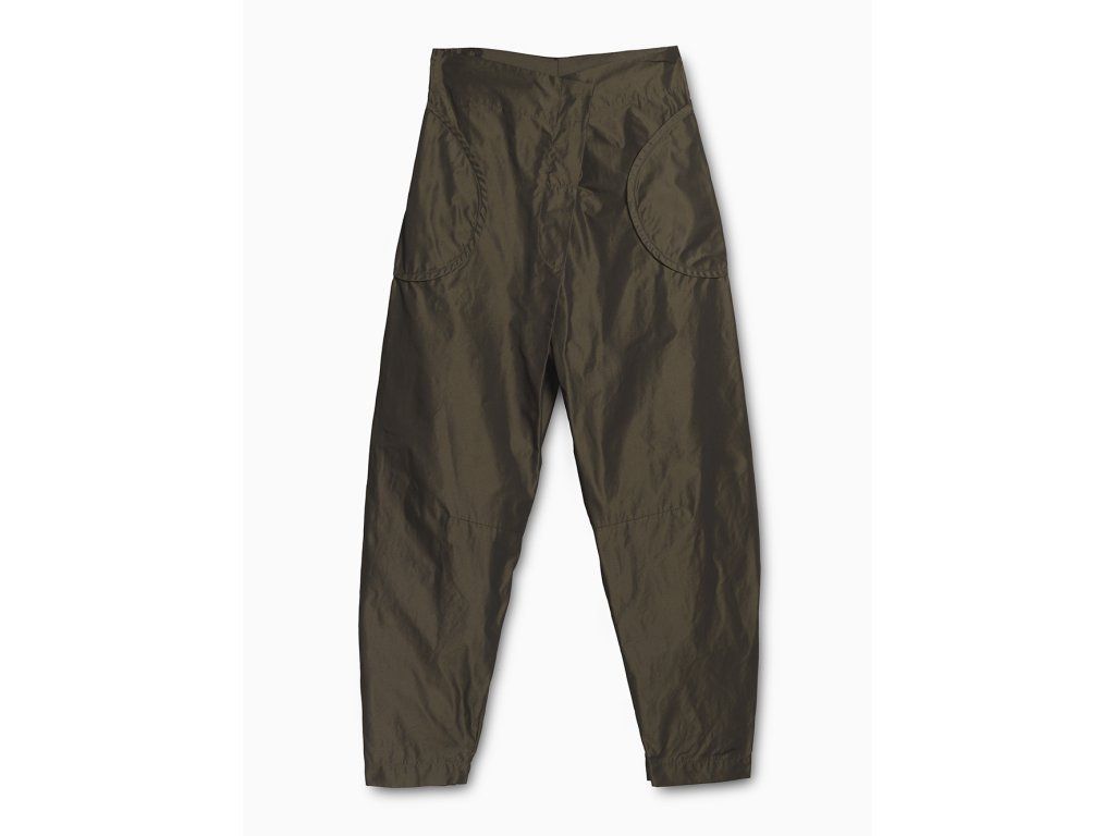 Kalhoty jsou ušité z memory materiálu, technického polyamidu s tvarovou pamětí. Tento materiál je lehký, jemně strukturovaný a dokáže si uchovat vytvořený objem, díky čemuž podporuje sochařský charakter střihu.