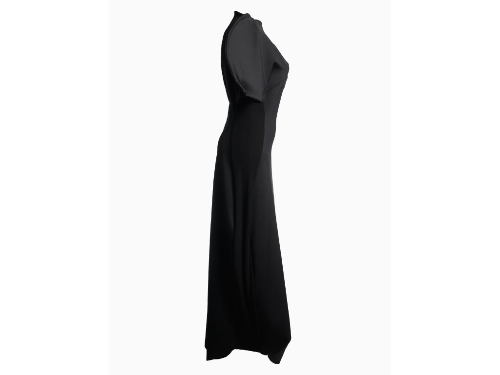 V oblasti boků je použit jemný žebrovaný úplet, který zvyšuje pružnost a přizpůsobivost šatů tělu. Díky této kombinaci je model nejen vizuálně výrazný, ale i pohodlný a funkční v pohybu.